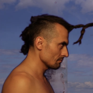The harms perpetrated in the name of religion and the punishments for defiance of authority are referenced in this video. The kaleidoscopic image breaks Theo’s figure into an unnatural creature, a kind of chimera with two torsos and two heads. There are somewhat confusing things taking place: Theo and a miniature reproduction of the Pieta sculpture are showered in feathered down and drenched in sticky, greasy fluid, like tarring and feathering, often a kind of vigilante punishment for perceived wrongs of a religious or nationalistic character. Theo describes these flows as glamorous sexuality leaking. Dreamy and grotesque