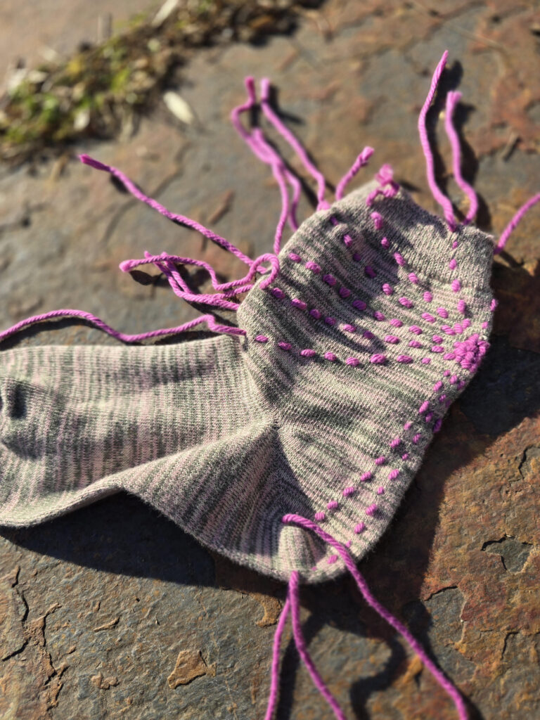 Here is one final visible mend for you: a writerly patch that I might have removed from this essay at one time. Begun in the wake of the Truth and Reconciliation Commission’s work, this reflection goes out now after having sat for a long while, not unlike the mending pile, emerging into a very different moment, on the other side of the COVID-19 pandemic, when public discourse is less reconciliatory and more overtly fascist, in which we are perhaps even more organized around crisis, around urgent action… I note that in the elapsed time, I have not in fact launched a public practice of #DevirtuousMending, unless that is what one can call resigning from academia mid-career. I mend, though not enough, and quietly, privately–for the sake of practicality, not show. My child’s sock; a friend’s hat; a moth-sheltering sweater.