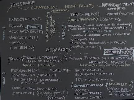 I also want to understand where curation is inhospitable, to recognize learned patterns and behaviours of professional practice that arrest creative growth and hinder relationship building, truth-telling, and (re)conciliation based in trust, support, and accountability. Radical hospitality within the role of the gallery strives for self-awareness and self-reflexivity, inclusion, reciprocity, and the equitable valuation of interdisciplinary and multidimensional needs, knowledges, and experiences (Marstine 2017, 165). This work pushes against the commodification of the art experience and arts administration as ‘service,’ often undertaken as hierarchical labour and understood through the frames of gender, class, and race (Burton, Jackson & Willsdon 2016, xvi). It is furthermore linked to curatorial care. Though ubiquitous as an etymological scaffold for curatorial discourse, concerns of the curatorial as care in relation to this project are not rhetorical, but speak to the realities of colonial capitalist-model hyper-productivity (Miner 2018, 131). Such over-commitment appears to be entrenched in curatorial bodies and overshadows slower and considered processes that may allow better care for the self (reconnecting body, mind, and land) to better care for and communicate with others (Jennifer Van de Pol in conversation with author, April 27, 2019).
