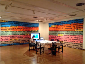 I developed this work with curator Amy Kazymerchyk with the support of director Melanie O’Brian. Amy and I had meetings with a number of predominantly Indigenous faculty and staff at SFU who were well-aware of the Calls to Action and were improving resources and options for Indigenous students across the University’s disciplines.[9] We wanted to know if and how the Calls to Action were being activated in departmental structure, pedagogy and curriculum. We wanted to investigate how SFU Galleries could make space, start dialogue, and chart new pathways for cross-departmental communication and action that could help re-shape the infrastructure of the institution. These faculty and staff enlightened us on the complex long-term endeavours many were engaged in and the many initiatives that were underway in the university. We were humbled to learn how much was already happening as we considered how SFU Galleries could contribute to these initiatives. This investigation and these conversations were all part of the WE CALL project.