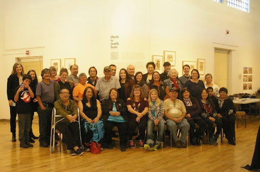 Photograph of Survivors of the Alberni IRS, the MacKay IRS, and the Inkameep Day School and their families at the Legacy Art Gallery during a two-day long family gathering through the exhibit, photo courtesy of Shelley Chester, 2017.