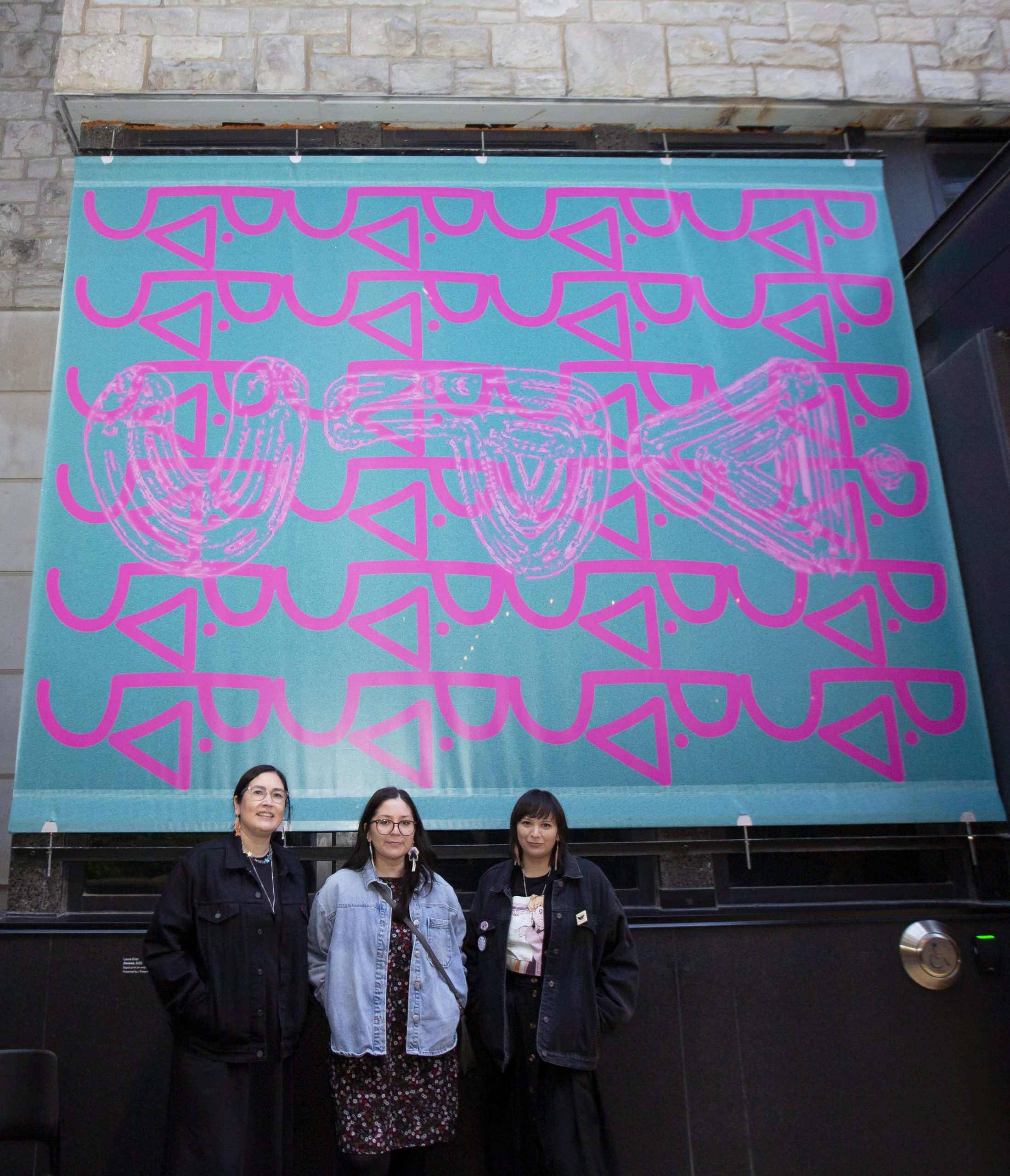 Artist-run centres like SAW have long supported artists who challenge conventions and reimagine artistic possibilities. In the Canadian context, these spaces have been crucial sites for Indigenous artists in asserting sovereignty over narrative, aesthetics, and process. In choosing to install Denewa at SAW, Grier steps into the legacy of resistance while actively contributing to its evolution. At 12 feet wide, the work’s monumental scale, along with its bright pink Dene syllabics, and the synthetic sheen of vinyl channel what scholar Jillian Hernandez (Black/Lantinx) defines as the “aesthetics of excess,” (2020) rendering Indigenous joy and struggle hyper-visible on its own terms.