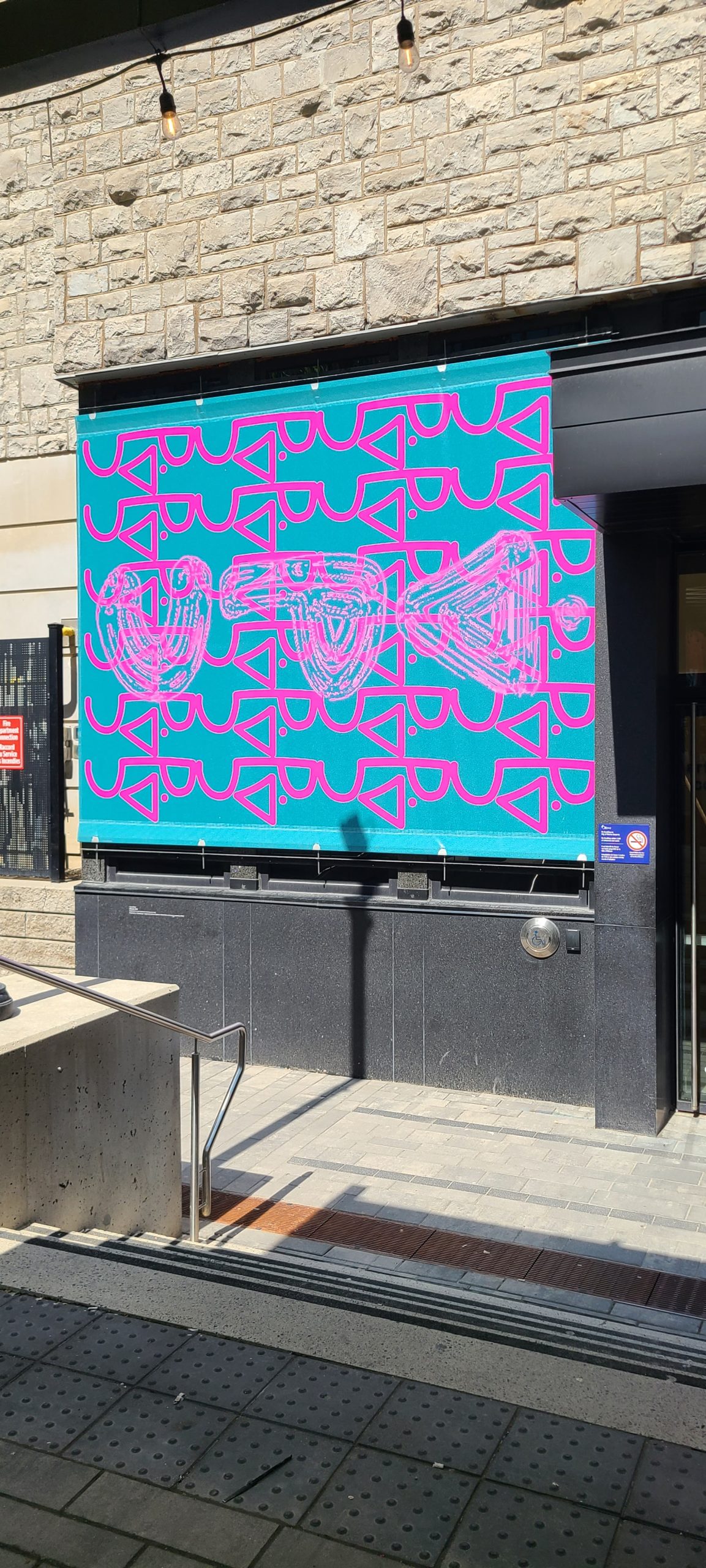 Denewa, Laura Grier’s (Sahtu Délı̨nę) first work on vinyl, extends their critical engagement with Dene aesthetics through the lens of digital materiality and experimental print processes. Installed as a large-scale digital print on vinyl within the courtyard at SAW Gallery, a key site of artistic resistance and experimentation within Canada’s cultural landscape, Denewa is both a personal and communal act—a mood, an aesthetic drift, a glow-lit hum of soft rebellion and neon intimacy, suspended somewhere between refusal and dreaming.