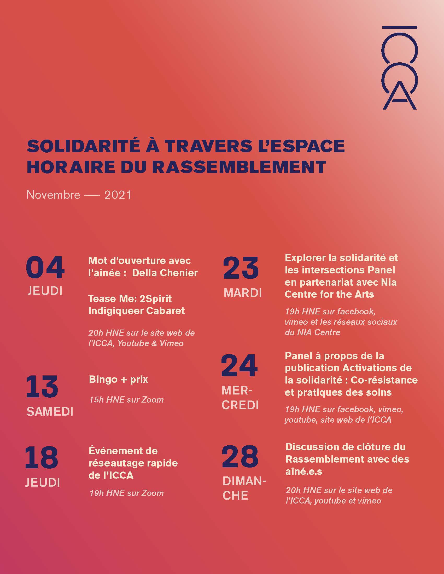 Le Collectif des commissaires autochtones (ICCA) est ravi de présenter son deuxième rassemblement virtuel, Solidarité à travers l’espace, qui se déploie autour du thème 2021 de la programmation de l’ICCA, solidarité. Ce rassemblement s’inscrit dans la continuité des discussions et réflexions autour des pratiques de soins initiées lors du Rassemblement virtuel 2020 de l’ICCA, Au-delà de l’espace : Un rassemblement sur les pratiques de soins (care) en temps incertains. Comme notre coordinateur.trice de l’engagement numérique Summer Taylor l’illustre et l’explique magnifiquement bien dans le visuel qu’iel a créé pour ce rassemblement, la solidarité est un voyage qui commence au bout de nos doigts, en nous-mêmes. Écouter, supporter et s’investir pour le bien-être de nos communautés fait partie de la croissance de ce voyage, comme tourner une nouvelle feuille.