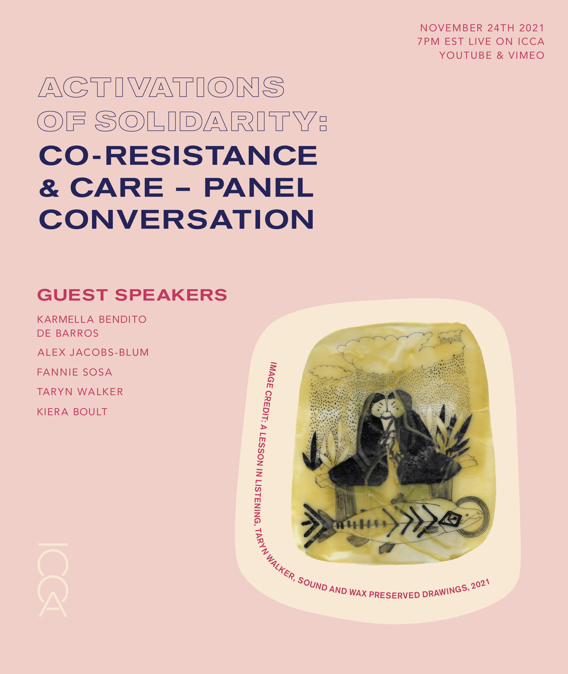 ICCA Director of Programming Camille Larivée and Program Coordinator Emily Critch will facilitate a conversation that explores the artistic practices of the artists in the recently launched online publication, Activations of Solidarity: Co-resistance and Care. Each of the artists will talk about each of their projects in the publication and what solidarity means to each of them. This panel will be presented live on the ICCA YouTube channel and Vimeo account on Wednesday November 24, 2021 at 7 PM EST.