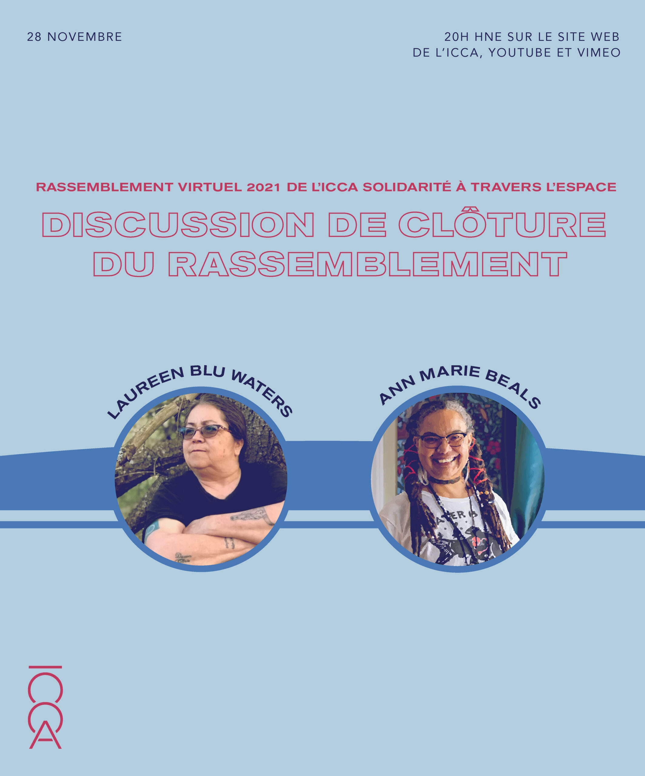 The ICCA 2021 Digital Gathering Solidarity Across Space will close with a conversation about Laureen Blu Waters and Ann Marie Beals about Black and Indigenous solidarity, and to reflect on the events held over the duration of the gathering. This closing event will be presented live on the ICCA YouTube channel and Vimeo account.