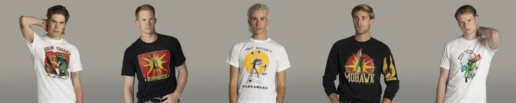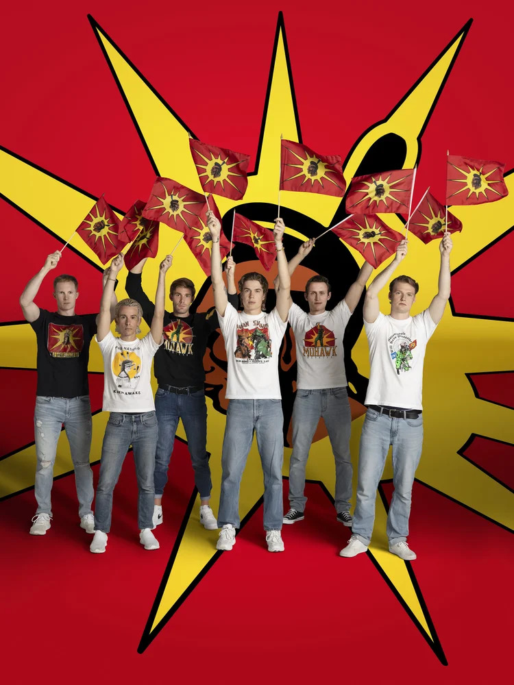 Dana Claxton: It’s really a totality of all of that. First, it was to honor Rick because he’s been a very generous man for many, many years. He’s a lovely art patron here in the city. And so it was to honor, pay, homage to him, but also, of course, to honor and pay homage to the Mohawk resistance. […] It’s still a complex situation in Canadian history, and still has rippling effects […] and then also to think about the complexity of casting seemingly non-Indigenous men in these T-shirts that are highly charged for some people. And also, further unpacking it. […] As we discussed in the pre-interview, is thinking about essentialism and […] these ideas that, only a Mohawk can wear a Mohawk t-shirt, or only an Indigenous person can wear a Mohawk T-shirt.