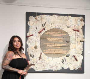 The door is the threshold into her exhibition “Apples and Train Tracks.” Inside, the scent of wood and earth mixes with the quiet weight of memory. The work is built from reclaimed pieces of her father’s Road Allowance home, with red willow branches, poetry, and painted canvases. It is a place where personal memory meets collective history. Every board, photograph, brushstroke are part of a living archive of the Road Allowance Métis.