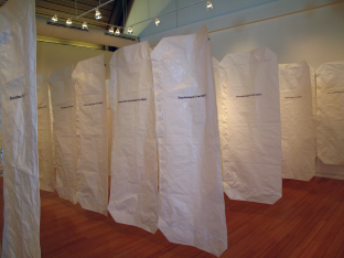 Bonnie Devine, Manitoba, 2010, 62 medical body bags, nylon filament, laser-cut lettering. Photo courtesy of the artist.